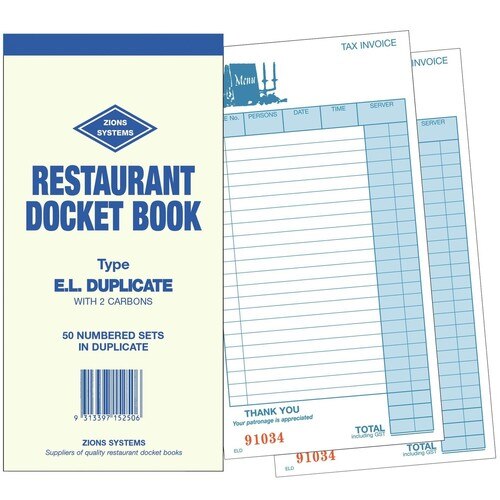 Zions Restaurant and cafe docket book | Zions offers a wide range of single, duplicate, triplicate and quadruplicate restaurant docket books, suitable for all styles of bistros, cafes, restaurants and take-away outlets | Strong cardboard backing for ease of order taking | Consecutively numbered on all copies | Recyclable | 50 sheets in duplicate with quality carbon paper | Both copies tear out from book | Consecutively numbered on both copies | 22 entries per docket printed in blue ink | Specifications