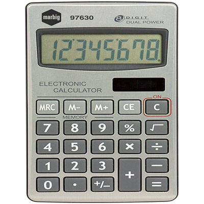 Marbig desk top calculator is solar powered with the added security of battery back-up for low light conditions | Ideal for calculations on the run | Extra slim design fits neatly into your hand and discretely slides away in a briefcase when not in use | Solar powered with the added security of battery back up for low light conditions | Features include 3 key full memory function, percentage and square root keys | Extra large 8 digit display for easy viewing | Soft rubberised keys for comfortable use - no more sticky keys