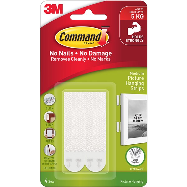 Command picture hanging strips make decorating quick and easy. One click tells you picture hanging strips are locked in and holding tight. Best of all, when you are ready to take down or move your pictures, they come off cleanly | Damage-free hanging | No nail holes | Holds strongly and removes cleanly | Picture locks in place | Works on a variety of surfaces |This product is sold individually. For PACK quantities, please order in multiples of 6. | Pack of 4