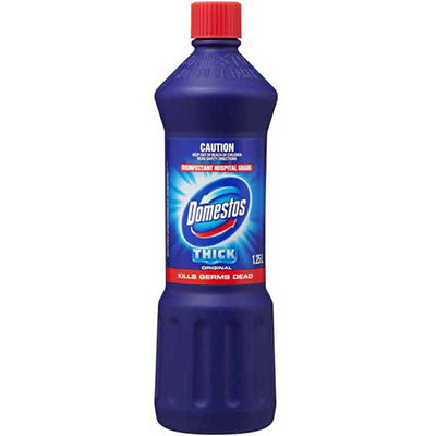 Domestos Multipurpose Bleach Original is a hospital-grade disinfectant that kills germs dead (Pseudomonas aeruginosa, Escherichia coli, Staphylococcus aureus and Proteus vulgaris) | Thick powerful Domestos cleans tough dirt and stains, removes mould and bad smells and is your powerful weapon to-kill germs dead | Thick, easy-to-use product that kills all known germs dead - even in the nastiest of places | Domestos can protect your family against germs and bacteria. So, whether you're fighting bacteria in the kitchen or germs in the toilet, there are many great Domestos uses when preventing germs at home | SAFETY WARNING | Precautions: do not use on enamel or plated metal (chrome/gold) surface. Do not use undiluted on floors. Do not use on wool, silk, coloureds, man made fibres, leather or garments with a special finish e.g. Flameproof. Always refer to the garment label. Take care not to spill on fabrics/furnishings/carpets as damage will result. Always wipe up spillages and rinse thoroughly with clean water. Wash hands after use | Keep out of the reach of children. Keep only in the original container. Avoid release in the environment. Wear protective gloves/protective clothing/eye protection/face protection. If on skin (or hair): Remove/take off immediately all contaminated clothing. Rinse skin with water/shower. If in eyes: Rinse cautiously with water for several minutes. Remove contact lenses if present and easy to do. Continue rinsing. Call a Poison Center/doctor if you feel unwell. Collect spillage. Dispose of contents/container in accordance with national regulations. CONTAINS: Sodium Hypochlorite, amines, coco alkyldimethyl, N-oxides, Sodium hydroxide, 1-hexadecanaminium, N,N,N-trimethyl-chloride | DIRECTIONS | Not to be used on medical devices or other therapeutic goods | Do not mix with detergents or other chemicals | Hard surface disinfectant only | Not to be used on skin | Recommended dilution 125mL of disinfectant with 5L of water | Remove mould from shower recesses and tiles | Clean and unblock drains and wastepipes | Disinfect rubbish bins and chopping boards | Gives a sterile clean for hospitals and dental surgeries | Squirt on desired area, spread evenly, leave for 10 minutes then rinse thoroughly | Dilute 125mL of Domestos in 5L of water | Remove germs and tough stains from bathroom surfaces | Remove grease and germs from kitchen surfaces | Clean and disinfect floors, paths and patios | Soak cups and plastic food containers for up to 1 hour to remove stains, germs and smells