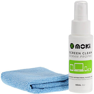 Moki Screen Clean is perfect for use with larger TV screens or portable devices that require regular, daily cleaning | The specially formulated spray, when used with the large ultrafine microfibre cloth, is ideal for keeping HDTVs, monitors, laptops and portable screens clear of dust, germs, fingerprints and other contaminates, ensuring your expensive equipment stays in top condition and sparkling clean for longer | Power Spray | Antibacterial | Alcohol free | Ultrafine Microfibre cloth | Lint free | Antistatic | Caution Keep out of reach of children. Avoid eye contact. If accidental contact occurs, flush eye with water for 15 minutes. Seek medical advice if irritation persists
