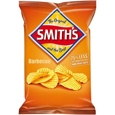 Smith's Crinkle Cut Barbecue Potato Chips - There is no better snack when watching the footy grand final, having a picnic or indulging after work | Our top quality Aussie potatoes are peeled and sliced to just the right crinkle cut thickness and cooked to perfection then sprinkled with our famous seasoning so you can enjoy the classic crunch and unbeatable Barbecue flavour that only a Smith's potato chip can bring! | Smith's Crinkle Cut Barbecue Potato Chips Perfect for any party | So stop reading, crack it open and start sharing | Made from top quality Aussie potatoes | Contains no artificial colours, no artificial flavours and are gluten free | You know you love 'em | Made from top quality Aussie potatoes | No artificial colours | No artificial flavours | Gluten Free | Perfect for any occasion | Crinkle Cut | Made in Australia | Ingredients: Potatoes, Canola Oil, Sunflower Oil, Sugar, Maltodextrin, Salt, Tomato Powder, Flavour Enhancers (621, 635), Food Acids (Sodium Diacetate, Citric Acid), Flavours, Mineral Salt (Potassium Chloride), Onion Powder, Garlic Powder, Natural Colour (Paprika Extract), Antioxidants (Tocopherols, Ascorbic Acid, Rosemary Extract)