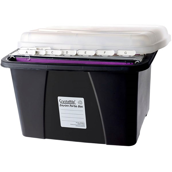 Crystalfile porta box has internal rails to store your suspension files, making it easier to transport all your documents | Rails to support foolscap suspension files | Translucent lid allows easy viewing of contents | Can be stacked for easy storage | Protects from dust, dirt and spillage | Base is made from a minimum 70% recycled pp and is 100% recyclable | Please note: Files not included