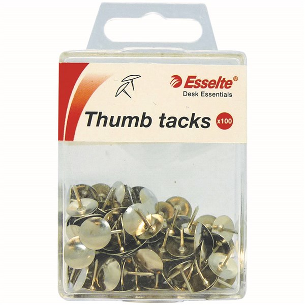 Esselte drawing thumb tacks to suit your needs, broad range of pins for everyday office easy use | Ideal for pin-pointing or highlighting an area, tacking posters, menus or charts to walls, cork boards or porous surfaces | Strong, silver coloured thumb tacks | 11mm dia head, 7mm long | Pack of 100