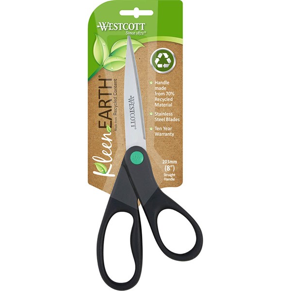 Lightweight and comfortable, multipurpose scissor | Perfect for cutting through layers of paper, foam and poster board | Made from recycled material with a stainless steel blade | The Handle of the Westcott Kleenearth Scissors contain 70 percent recycled plastic and 30 percent post consumer | Handle is suitable for left and right handed use |This product is sold individually. For PACK quantities, please order in multiples of 6.