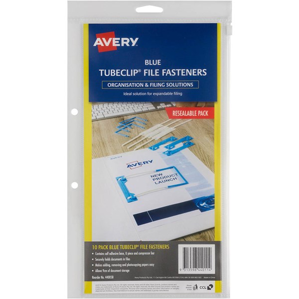 Finding a space saving solution is really not as daunting as you think | Avery Tubeclip 3 piece set is versatile and really is a great solution to save space | You don't even need to switch your filing system to enjoy this wonderful solution as Avery Tubeclip can be used with either manilla files or shelf lateral files | The Avery Tubeclip expands as the file fills in order to reduce wasted space | Tubeclip 3 piece set comes with self adhesive base, a plastic U piece and a plastic coloured compressor bar | Suitable for securing documents that require easy access and frequent use | Allows pages to be added or removed at any position within the file | Pack of 10