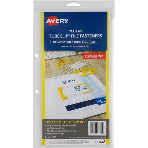 Finding a space saving solution is really not as daunting as you think | Avery Tubeclip 3 piece set is versatile and really is a great solution to save space | You don't even need to switch your filing system to enjoy this wonderful solution as Avery Tubeclip can be used with either manilla files or shelf lateral files | The Avery Tubeclip expands as the file fills in order to reduce wasted space | Tubeclip 3 piece set comes with self adhesive base, a plastic U piece and a plastic coloured compressor bar | Suitable for securing documents that require easy access and frequent use | Allows pages to be added or removed at any position within the file | Available in yellow, red and blue colour to suit your preferences | Designed to eliminate wasted space as Tubeclip expands as your file fills | Pack of 10