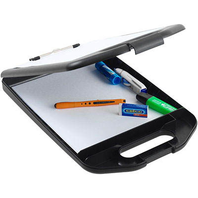 Marbig Professional Series storage clipboard | Storage clipboard top opens to a filing space beneath to store loose papers, brochures and documents | Durable hard plastic ensures a sturdy writing area | Portable, perfect for those on the go | Wire clip keeps documents secure | Includes white board writing area