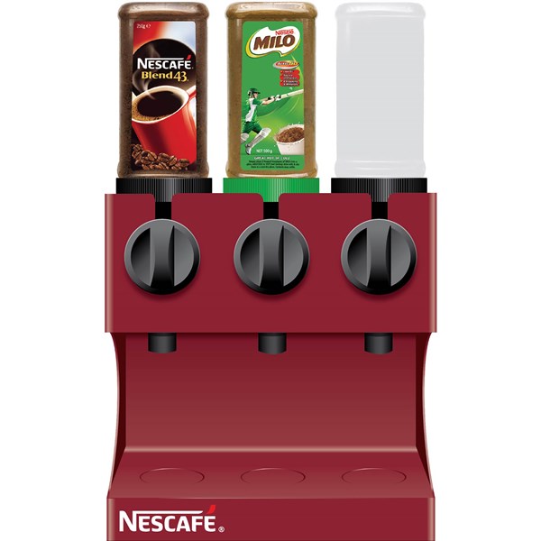 Nestle Beverage Bar is a perfectly clean and convenient beverage solution for your office | Tidy, convenient and hygienic beverage solution, perfect for any kitchen or coffee break area | Enhanced dosing mechanism | Self-standing, no longer just wall mounted | Easy cup placement guides | Sleek look and easy to clean | Includes a jar each of Nescafe Blend 43, Nestle Milo and an empty jar for sugar or soup