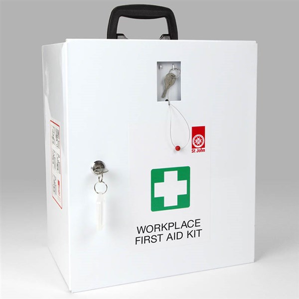St Johns National Standard Kit Wall Mount is compliant within all states and is suitable for workplaces up to 100 employees | Designed with the First Aid attendent and recipient in mind, the quality first aid kit is manufactured under TGA license and is complient with new WHS legislation released in January 2012 | Give your employees peace of mind with this first aid provision, suitable for most common workplace injuries | Compliant with new WHS legislation changed in January 2012 | | Refill kit available: 7108434 - ST JOHN WORKPLACE REFILL PACK | KIT CONTAINS | 1 x St John Bag Resealable Plastic Small | 1 x St John Bag Resealable Plastic Medium | 1 x St John Bag Resealable Plastic Large | 3 x St John Bandage Conforming 5cm | 3 x St John Bandage Conforming 7.5cm | 1 x St John Bandage Compression 10cm | 2 x St John Bandage Triangular 110cm | 1 x St John Blanket Emergency Accident | 1 x St John Cold Pack Instant | 1 x St John Dressing Combine 10cm x 20cm | 1 x St John Dressing Non-Adherent 10cm x 10cm | 3 x St John Dressing Non-Adherent 7.5cm x 10cm | 6 x St John Dressing Non-Adherent 5cm x 5cm | 1 x St John Dressing Wound No. 14 | 1 x St John Dressing Wound No. 15 | 5 x St John Gloves Nitrile Large 2s | 4 x St John Pad Eye | 1 x St John Pocket Mask CPR | 1 x St John Strips Adhesive Plastic 50s | 5 x St John Swabs Gauze 7.5cm x 7.5cm 5s | 1 x St John Tape Hypoallergenic 2.5cm x 9m | 1 x Forceps Sharp Stainless Steel 12.5cm | 1 x Pins Safety Assorted 12s | 2 x Probes Splinter 5s | 5 x Sachet Burnaid 3.5g | 8 x Saline Eye and Wound Irrigation 15mL | 1 x Scissors Sharp-Blunt Stainless Steel 12.5cm | 10 x Swabs Povidone-Iodine | 10 x Wipes Antiseptic | 1 x St John Emergency First Aid A Quick Guide | 1 x St John Notepad and Pencil | 1 x Pen Ballpoint Black