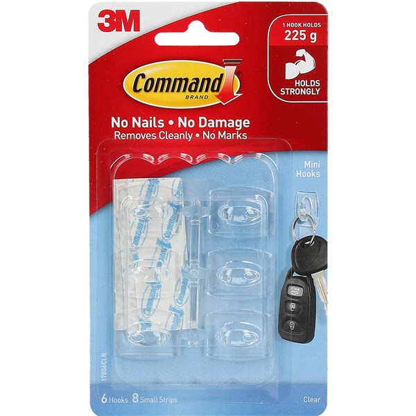Command Clear removable hooks (6 hooks) holds up to 225g | Damage-free hanging | Clear design blends in with any wall surface | The revolutionary Command Clear Adhesive Strip holds strongly on a variety of surfaces, including paint, wood, tile and more | No nail holes | Holds strongly and removes cleanly | Easy to apply | Works on a variety of surfaces | Great for hanging keys, calendars and other small objects |This product is sold individually. For PACK quantities, please order in multiples of 6.