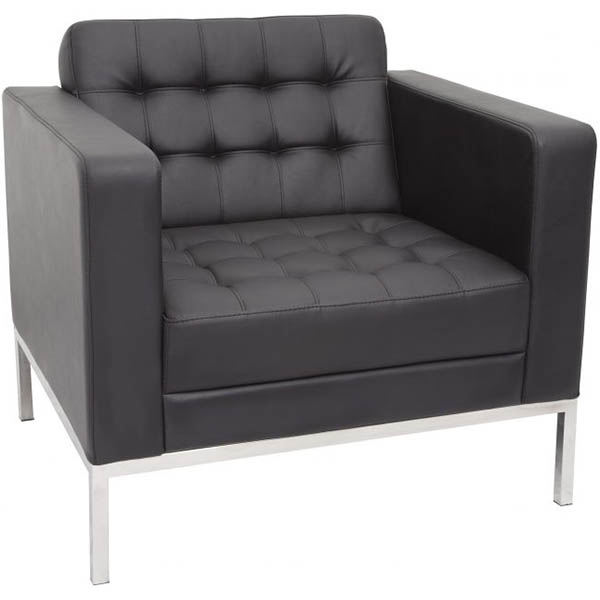 Rapidline Venus lounge with distinctive button finish ideal for reception or meeting areas | Elegant reception area single seat arm chair with button finish to black PU, easy clean upholstery | Stainless steel underframe and legs | Backed by a 3 year warranty | Button finish | SGS: EN12520 Certification | Due to freight costs, some orders may incur a delivery charge and this will vary depending on the order, particularly in regional areas. Delivery costs can be confirmed at the time of order. Some items require assembly, if you need help this can be advised at the time of order. A service fee for assembly/installation may also apply. Delivery lead times may apply to some items, this can be confirmed at the time of order