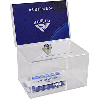 Italplast lockable ballot box | Acrylic A6 Ballot Box complete with key lock and 2 metal keys | Suitable for use as ballot box, suggestions box, donation box or competition entry box | Ideal to accept suggestion card, business cards, notes or coins | Displays an A6 header card