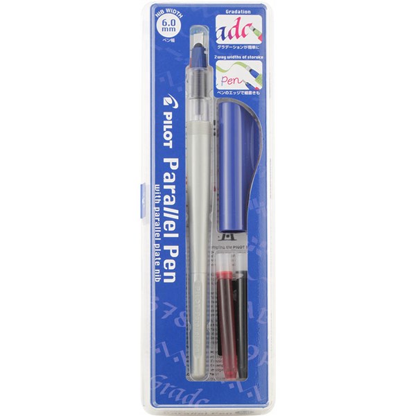 The Pilot Parallel calligraphy pen represents a major breakthrough in calligraphy pen design! | The pen nib consists of two parallel plates, allowing the writer to produce lines sharper than existing calligraphy pens | Special mixable ink, you can use two Parallel pens to create blended colour lines | Includes one black ink cartridge, one red ink cartridge, one pen cleaner pipette, one nib cleaner, and an instructions pamphlet