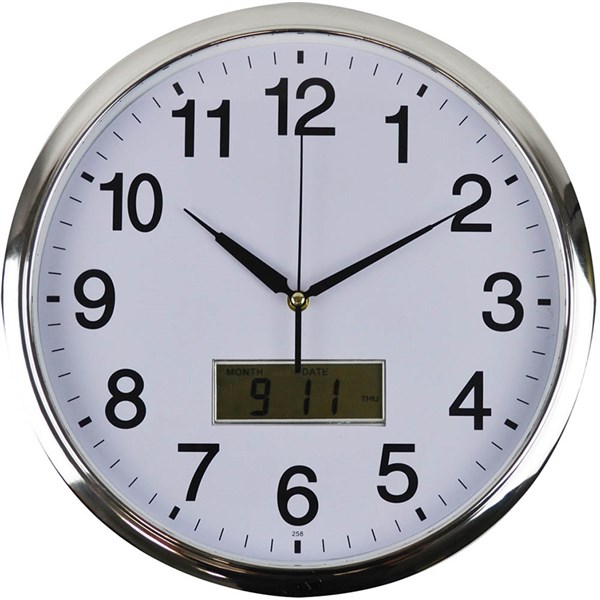 Do more than just tell the time with this Contemporary wall mountable clock with LCD date and month display | Suitable for corporate environment and home office | Chrome Trim | Large number display | Silent second hand | Wall mountable | Requires 2 x AA battery (not included)