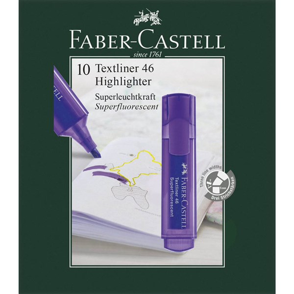 Faber-Castell Textliners contain a versatile tip allowing you to mark in 3 line widths, depending on the angle you hold the pen | Textliners contain a water-based, super fluorescent ink making them perfect for use on most papers | 1mm, 2mm or 5mm lines depending on the angle you hold the chisel nib | Perfect for marking and emphasising text, diagrams and other important work | Water-based ink which ensures super fluorescent marking | Pen colour matches the ink colour to help you find the right highlighter |This product is sold individually. For BOX quantities, please order in multiples of 10. | Box of 10