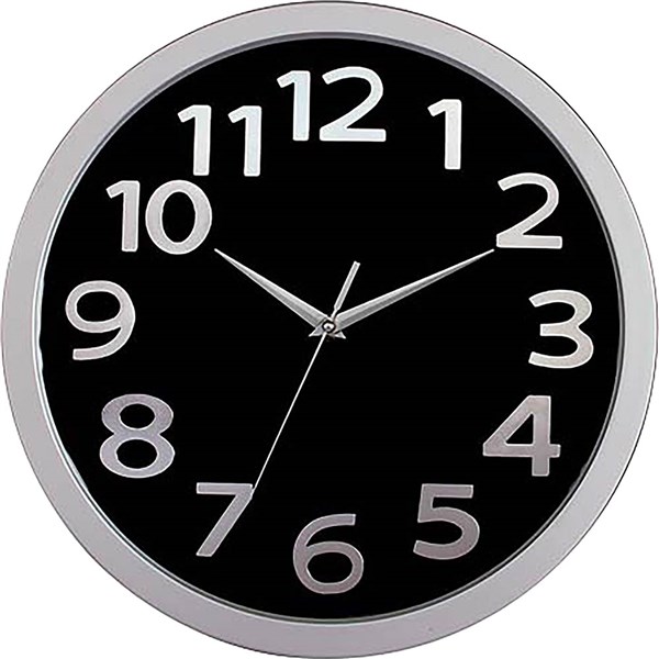 High quality analogue clock that can be wall mounted | The second hand does not 'Tick' but moves in a silent steady sweeping motion | 330mm clock suitable for corporate environment and home office | Glass face | Silver frame and numbers | Black clock face | Wall mount | Powered by a single AA battery (not included) | 12 month warranty