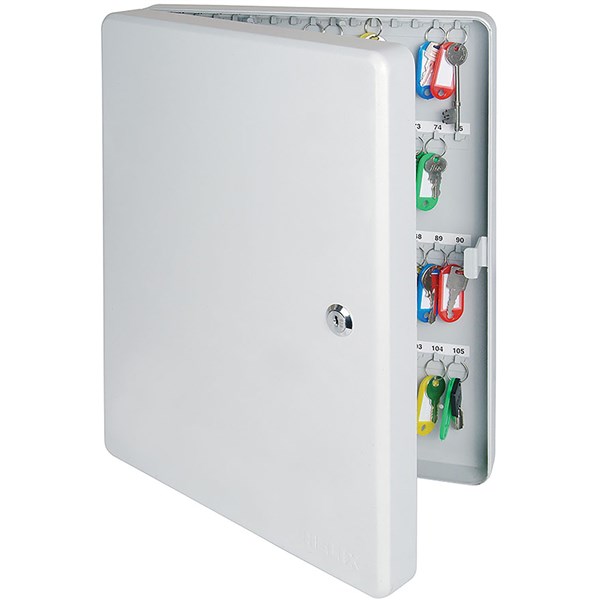 Key cabinets specifically designed to make key management much easier | Tough steel key safe with a grey powder coat finish | Metal key hooks that accomodate most key tags | Door lock comes with 2 keys | Comes with a wall fixing kit, index sheet, key labelling kit and more
