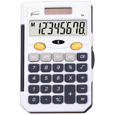 Handy handheld calculator ideal for pockets or business cases | Hard cover casing for protection | 8 digit large display | Features durable plastic keys | Dual power - solar and battery | Battery LR1130 is included | 1 year warranty