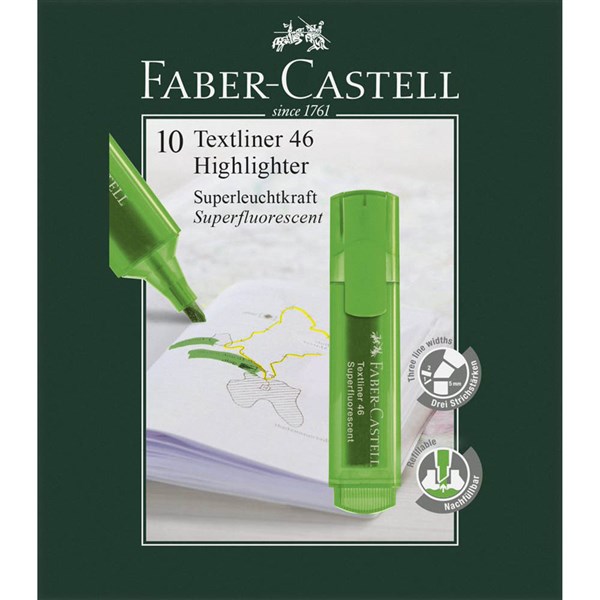 Faber-Castell Textliners contain a versatile tip allowing you to mark in 3 line widths, depending on the angle you hold the pen | Textliners contain a water-based, super fluorescent ink making them perfect for use on most papers | 1mm, 2mm or 5mm lines depending on the angle you hold the chisel nib | Perfect for marking and emphasising text, diagrams and other important work | Water-based ink which ensures super fluorescent marking | Pen colour matches the ink colour to help you find the right highlighter |This product is sold individually. For BOX quantities, please order in multiples of 10. | Box of 10