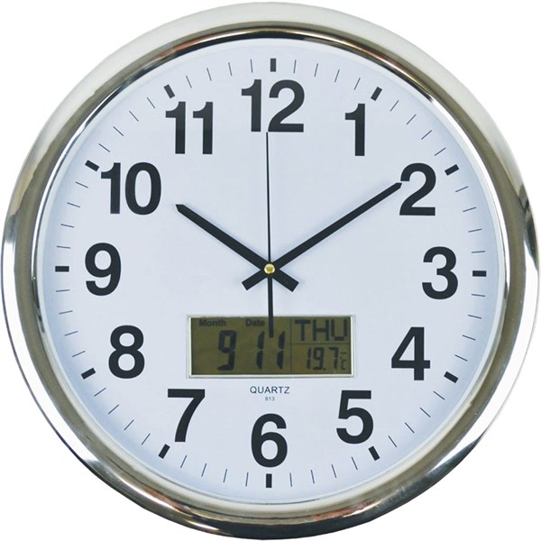 Do more than just tell the time with this Contemporary wall mountable clock with LCD date and month display | Suitable for corporate environment and home office | Chrome Trim | Large number display | Silent second hand | Wall mountable | Requires 2 x AA battery (not included)