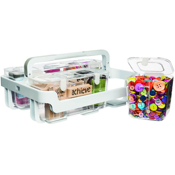 Stackable Caddy Organiser | A mobile organiser perfect for on-the-go storage | Removable, interchangeable containers feature hinged, snap tight lids | Lids can also be taken off for easy, unrestricted access | Integrated handle/locking tabs allow multiple units to link together | Canisters can be used with unit or separately | Innovative Lift and Lock feature connects multiple units together | Individual containers can hang on wall with Deflecto Mounting Bar (7054803 sold separately) | White frame with clear canisters | BPA free plastic construction | Please note: Image representation only. Contents not included