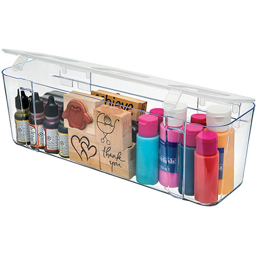 Great for on-the go storage of buttons, stamps, ribbon, stickers, paint, and more | Multiple units can be stacked and locked using the lift and lock feature | Removable storage containers feature hinged, snap-tight lids | Modern look is appealing and trendy for your storage space | Lids can be removed for easier-access to supplies | Compatible with the Deflecto Caddy Organiser (7054796 sold separately) | Individual containers can hang on wall with Deflecto Mounting Bar (7054803 sold separately) | BPA free plastic construction | Please note: Image representation only. Contents not included