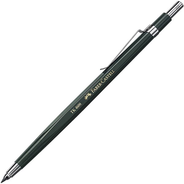 The classic, reliable and familiar pencil for artists and technicians from Faber-Castell | Equipped with clip and ergonomic finger grooves | The powerful jaws grip the lead firmly | The end cap comes with a sharpener inside | The TK4600 clutch pencil has a slender and even shaft with its balance point oriented towards the tip | Fitted with grade of hardness HB, refillable with 11 different grades of hardness | Clutch pencil for writing, drawing and sketching | Hexagonal barrel with ergonomic round grip | Rugged engineering | Strong clutch holds the lead firmly | Lead sharpener in push-button | Refill with TK9071 leads in 11 grades of hardness (6H-3B)
