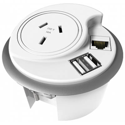 Rapidline In Desk Modules | Fits into Standard 80mm Cable Port or Requires Additional 80mm Diameter Cut Out | Links to Cable Basket, Adjoining Power Rail, Wall Starter or Power Pole Kit | Data Jack Not Included | Includes 3 Removable Covers For Different Configurations, 2 x 2.1 USB Charging Ports , 1 Auto Switched GPO And 1500mm Lead With 3 Pin Plug | Backed by a 2 year warranty