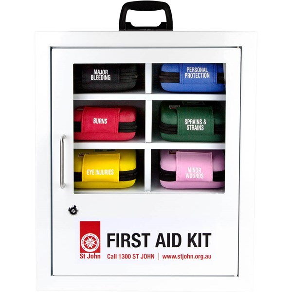 The St John Workplace Modular Wallmount Kit is uniquely designed and comes available in 6 modules with clear labels of the pertinent injury | Diagnose and respond with the appropriate modules to treat injuries at the patient location | This Workplace Modular First Aid Kit is also wall mountable for easy access and saves space | Clearly labelled modules combine to make the Workplace Modular First Aid Kit compliant with WHS recommendations in Australia | Replacements are available to easily replace used modules or optimise your kit by purchasing additional modules to cover common issues in your environment | This kit comprises of a sprains and strains, minor wounds, major bleeding, burn injuries, eye injuries and a personal protection set, enabling the first aider to swiftly respond in an emergency | KIT CONTAINS | Sprains and Strains Module | 1 x 1064 Compression Bandage 10cm | 1 x 1210 Instant Cold Pack | 1 x 1181 Triangular Bandage | Minor Wounds Module | 10 x 505400 Cleansing Wipes | 10 x 505300 Povidone-iodine swabs | 1 x 305402L Gloves Nitrile 2s Large | 2 x 309105 Splinter Probes 5s | 1 x 2230 Adhesive strips plastic 50s | 2 x 5111 Saline 15mL | 3 x 1020 Conforming 75mm | 2 x 1010 Conforming 50mm | 3 x 2140 Non-Adherent 75 x 100mm | 6 x 2152 Non-Adherent 50 x 50mm | 1 x 3070 Forceps | 1 x 3130 Safety Pins 12s | Major Bleeding Module | 1 x 4070 Bag resealable small 100 x 180 mm | 1 x 4080 Bag resealable medium 150 x 230 mm | 1 x 4090 Bag resealable large 230 x 300mm | 1 x 1181 Triangular Bandage 1100 x 1100mm | 1 x 3080 Emergency Accident Blanket | 1 x 2090 Wound Dressing No. 14 | 1 x 2091 Wound Dressing No. 15 | 2 x 5111 Saline Steritube 15ml | 1 x 3010 Scissors Medical 125mm SS Sharp/Blunt | 1 x 2060 Combine Dressing 100 x 200mm | 1 x 2130 Non-adherent Dressing 100 x 100mm | 5 x 2025 Gauze Swabs 75 x 75mm x 5 | 1 x 305402L Gloves Nitrile Large | Burns Module | 2 x Burns Instruction Card | 3 x 1020 Bandage Conforming Light 75mm | 2 x 5145 Burnaid Dressing 100 x 100mm | 1 x 2103 Small Poly sheet 100 x 100mm | 1 x Medium 2102 Poly sheet 100 x 200mm | 1 x Large 2101 Poly sheet 610 x 920mm | 8 x 5140 Burnaid sachet gel | Eye Injuries Module | 1 x 1010 Bandage Conforming Light 50mm | 1 x 1128 Tape hypo-allergenic 25 x 90mm | 4 x 2170 Eye Pad | 2 x 2025 Gauze Swabs 75 x 750mm 5s | 4 x 5111 Saline Steritube 15ml | Personal Protection Module | 1 x 354809 Resuscitation Mask | 2 x 305402L Gloves Nitrile Large | Bottom Shelf | 1 x 3140 Notepad Pencil in bag | 1 x 3646 Pen Ballpoint (black ink) | 1 x 3225/1 Emergency First Aid Book | 1 x 2230 Adhesive Strips hypo-allergenic 50s | 1 x 2257 Fabric Strips 50s | 1 x 5143 Burnaid burn Gel Spray 50ml | 1 x 515413 Rapaid Antiseptic Spray 50ml | 1 x 121004 Instant Cold Pack Mini | 1 x 4030 Gallipot | 1 x 343002 Sharps Container 150ml | 1 x 4010 Kidney Dish
