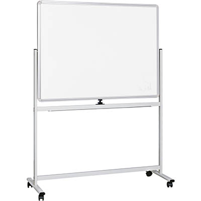 Double sided mobile whiteboard with quality dry wipe writing surface | Steel stand construction with locking castors | Board pivots 360 degrees with middle locking mechanism | Ideal for meetings areas and training applications | Magnetic surface | Board pivots 360 degrees | Steel stand with locking castors | 2 year surface warranty | Due to freight costs, some orders may incur a delivery charge and this will vary depending on the order, particularly in regional areas. Delivery costs can be confirmed at the time of order. Some items require assembly, if you need help this can be advised at the time of order. A service fee for assembly/installation may also apply. Delivery lead times may apply to some items, this can be confirmed at the time of order