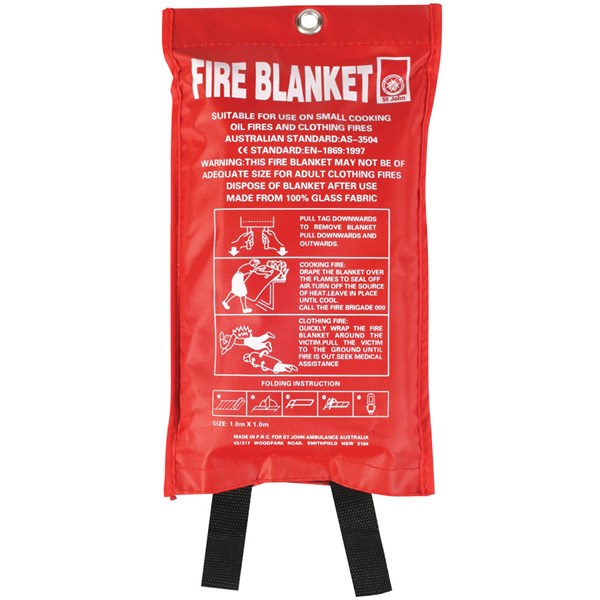 St John Fire Blanket | Rough woven finish prevents it from slipping once placed in position | Commonly for smothering small flammable liquid fires | These Fire Blankets are made from an incombustible glass fabric of twill construction | Can be used to wrap a person to smother burning clothes | Suitable for factory, home, vehicle or office use | Applications include cooking oil and fat fires | Quick release design | Complies with AS/NZS 3504:2006