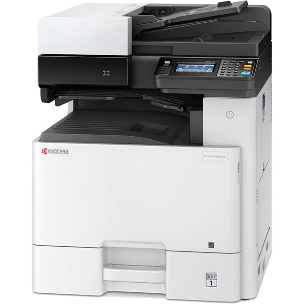 General type: Colour Multifunctional for A4/A3 Format | Technology: KYOCERA ECOSYS, COLOUR Laser, HyPAS | Engine speed: Up to 24/12 pages A4/A3 per minute in colour and b/w | Resolution: 1200 x 1200 dpi (print) 600 x 600 dpi (scan/copy) | Warm-up time: Approx. 30 seconds or less | Time to first print: Approx. 7.5 seconds or less in b/w, 10.2 seconds or less in colour | Time to first copy: Approx. 8.5 seconds or less in b/w (DP) 11.0 seconds or less in colour (DP) | Dimensions: 590(w) x 590(d) x 753(h)mm (with standard Document processor) | Weight: Approx. 76kg (with standard Document Processor) | Power consumption: Sleep-mode: 0.5W, Stand-by: 70 W, Copying/Printing: 550 W | Power source: AC 220 to 240 V, 50/60 Hz | Noise (ISO 7779): Stand-by: 34 dB(A), Copying/Printing in b/w: 52 dB(A) Copying/Printing in colour: 53 dB(A) | Safety standards: TUV/GS, CE - This product is manufactured according to ISO 9001 quality standard and ISO 14001 environmental standard | General memory: 1,536 MB, max. 3,072 MB | | PAPER HANDLING | Input capacity: 100-sheet multi-purpose tray, 60-256 g/m2: A3, A4, A5, A6, B5, Ledger, Letter, Legal, Folio, Custom (98 x 148 to 297 x 432 mm) 500-sheet standard universal paper cassette, 60-256 g/m2, A3, A4, A5, B5, Ledger, Letter, Legal, Folio | Max. input capacity with options: 1,600 sheets | Duplex unit: Standard duplex unit: 60-256 g/m2 | Max. output capacity: Max. 280 sheets; 250 sheets face-down (Main Tray), plus 30 sheets (standard Job Separator Tray) | Document processor: Standard reversing document processor: 50-sheet, Simplex scan 45-160 g/m2, Duplex scan 50-120 g/m2, A3, A4, A5, B5, Letter, Legal, Custom (140x182 to 297x432mm) | General paper handling: All paper capacities quoted are based on a paper thickness of max. 0.11 mm. Please use paper recommended by KYOCERA under normal environmental conditions | | PRINT | Processor: ARM Cortex-A9 Dual core1.2 GHz | Controller language: PRESCRIBE IIc | Emulations: PCL 6 (5c/XL), KPDL3 (Postscript 3 compatible), PDF Direct print, XPS Direct print and Open XPS | Fonts: 101 outline fonts (PCL 6, KPDL3, Windows Vista), 1 bitmap font, 45 types of one-dimensional barcodes, 1 type of two-dimensional barcode (PDF417) | Integrated Accounting: 100 department codes | Features: Encrypted PDF Direct Print, IPP printing, e-mail printing, WSD print, secure printing via SSL, IPsec, SNMPv3, quick copy, proof and hold, private print, job storage and job management functionality | Standard Interfaces: USB 2.0 (Hi-Speed), 2 x USB Host Interface, Gigabit Ethernet (10BaseT/100BaseTX/1000BaseT), optional Wi-Fi (IEEE 802.11b/g/n, 2 eKUIO slots, for optional internal print server or SSD hard disc and for optional fax system, Slot for optional SD Card, NFC tag | Applicable OS: All current Windows operating systems, Mac OS X Version 10.5 or higher, UNIX LINUX , as well as other operating systems on request | | COPY | Max. original size: A3/Ledger | Digital copy features: Scan-once-copy-many, sort, 2in1, 4in1, job reserve, priority print, program, auto duplex copy, split copy, continuous scan, auto cassette change (PF-470 or PF-471 is required), copy density control, Prevent Bleed-Through, ID card copy, Skip blank page | Exposure modes: Auto, manual: 7 steps | Preset magnification ratios: 5 Reductions / 5 Enlargements | Zoom range: 25 - 400 % in 1% steps | Continuous copy: 1 - 999 | Image adjustments: Text, photo, text + photo, Map, Printed document | | SCAN | File type: PDF, PDF/A, JPG, TIFF, XPS, PDF/A-1a/b, PDF/A-2a/b/u, Encrypted PDF High Compresson PDF | Scan features: Colour scan, integrated address book, Active Directory support, encrypted data transfer, multi send (e-mail, fax, SMB/FTP folder, print) at once, Blank page skip | Original recognition: Text, photo, text + photo, light text, optimised for OCR | Max. scan size: A3/Ledger | Scan functionalities: Scan-to-Email, Scan-to-FTP, Scan-to-SMB, Scan-to-USB Host, Network TWAIN, WIA, WSD scan | Scan resolution: 200, 300, 400, 600 dpi (256 greyscales per colour) | Scan speed: b/w: 50 ipm (300 dpi, A4), Colour: 50 ipm (300 dpi, A4) | | FAX (Optional) | Compatibility: ITU-T Super G3 | Modem speed: Max. 33.6 kbps | Scanning speed: 2.0 second or less | Transmission speed: Max. 33.6 kbps | Scanning density: Normal: 8 dot/mm x 3.85 line/mm, Fine: 8 dot/mm x 7.7 line/mm, Superfine: 8 dot/mm x 15.4 line/mm, Ultrafine: 16 dot/mm x 15.4 line/mm, Halftone: 256 gray scales | Max. original size: A3/Ledger | Compression method: JBIG, MMR, MR, MH | Fax features: Network fax, duplex transmission and reception, encrypted transmission and reception, polling transmission and reception, broadcast | | INTERFACES | Standard interface: USB 2.0 (Hi-Speed), 2 x USB Host Interface, Gigabit Ethernet (10BaseT/100BaseTX/1000BaseT), optional Wi-Fi (IEEE 802.11b/g/n), 2 eKUIO slots, for optional internal print server or SSD hard disc and for optional fax system, Slot for optional SD Card, NFC tag | | WARRANTY | Warranty: 3 Years On Site Warranty (depending on the country). KYOCERA guarantees the drum and developer for 3 years or 300,000 pages (whichever occurs sooner), provided each device is used and cleaned in accordance with the service instructions | OEM: M8124CIDN | Please note, a USB Printer cable is not included | Due to freight costs, some orders may incur a delivery charge and this will vary depending on the order, particularly in regional areas. Delivery costs can be confirmed at the time of order. Some items require assembly, if you need help this can be advised at the time of order. A service fee for assembly/installation may also apply. Delivery lead times may apply to some items, this can be confirmed at the time of order