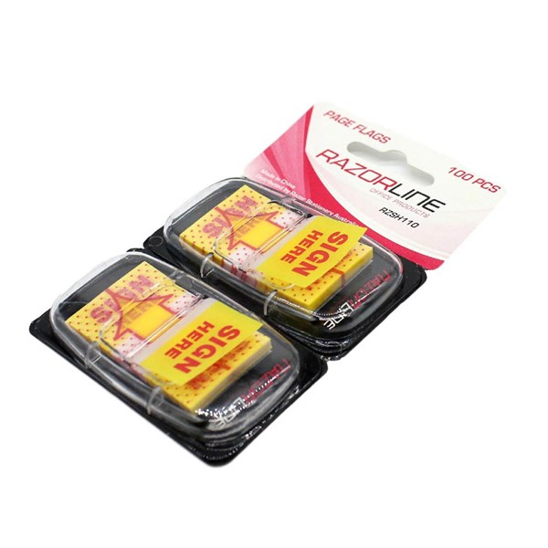 Razorline Sign Here Flags are perfect for use to mark and emphasise areas of important documents which require signatures | They have a strong self-adhesive backing to stay put and then remove easily without leaving any sticky residue | Bright and eye-catching "Sign Here" flags for quick document marking | Ideal for contracts, forms, and approvals | Removable adhesive allows repositioning without leaving residue | Helps streamline workflow and highlight important signing areas | Compact and convenient for office, school, or personal use