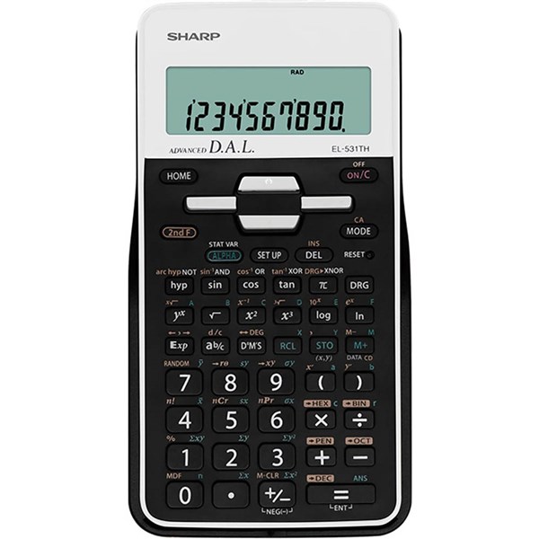 Sharp EL-531TH Scientific Calculator | A scientific calculator designed for usage in science, engineering, and mathematics. Great for school or engineers | Two-line display showing equation entered on top line and answer on the bottom line allowing users to check both the equation and answer at the same time. User can amend the equation if needed | Powered by 1 x AAA battery. Battery is secured with child-safe lock | Recall previous equations, storing up to 142 characters. 9 values can be stored in calculator, with 8 temporary memories and 1 independent memory | Calculator is approved by the Board of Studies. Can be used in schools | Store up to 272 scientific and statistical functions in calculator | Hard cover to protect calculator from scratches and for easy storage. Great for students to store their calculators in their school bags | A portion of the equation is automatically memorised as a constant ( function Plus, Minus, Division, Multiplication) , thus omitting redundant input. E.g. 2 x 5 = 10 pressing = will multiply by 5 again | This function is great for instances where you'll need to calculate the same equation with a different variable e.g. stocktake or estimating sales | The square root of a number is a value that when multiplied by itself equals the original number. Great for jobs like architects, carpenters and engineers | For easier reading of long, multi-digit numbers, comer or apostrophe is inserted for each group of three digits. E.g. 10 thousand will displayed as 10,000 | Allows you to enter numbers as fractions | Allow equations to be entered without having to key the answer from previous equation repeatedly | To use the calculator for statistic calculations. Great for students or engineers | | Recommended High School Model | Approved by NSW Board of Studies | Large, high resolution, 2 line LCD screen with upper 12 digit (5x7 - dot matrix)/lower 10 digit (mantissa) + 2 (exponent) digit | Up to 273 scientific and statistical functions | Battery operated (1x AAA)