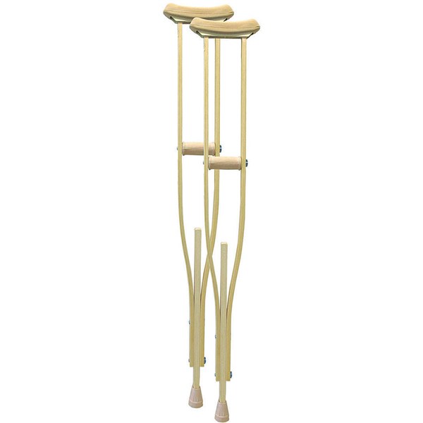 Adjustable wooden under arm crutches | These adjustable crutches are a helpful tool for first aid rooms and emergencies | Comes with an adjustable handle and leg height to suit the patient's needs | Wing-nut adjustment allows for easy height and hand grip changes | Lightweight | Adjustable | Cushioned armrest