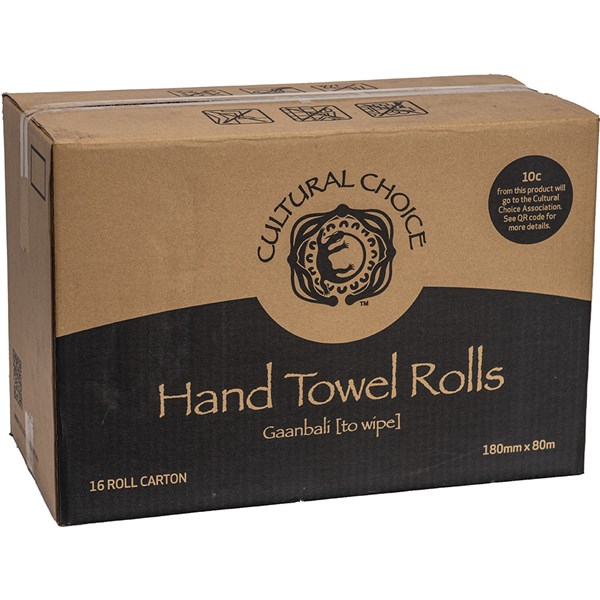 Cultural Choice Recycled Paper Hand Towel | By choosing Cultural Choice products, you are directly supporting the work of Cultural Choice Association Inc which was established to assist in the prevention of Aboriginal and Torres Islander youth suicide and its related causes in Australia | Soft and absorbent roll towel | Made from recycled paper | Sourced from sustainable forests | GECA certified | Carton of 16 rolls