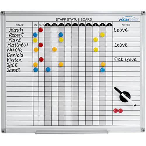 Staff Status Planner | Ideal for every busy workplace or staff roster system | Supplied with Magnetic marker buttons, Black adhesive letters/numbers, Bonus black marker, White magnetic name blocks | In and Out staff status | Due to freight costs, some orders may incur a delivery charge and this will vary depending on the order, particularly in regional areas. Delivery costs can be confirmed at the time of order. Some items require assembly, if you need help this can be advised at the time of order. A service fee for assembly/installation may also apply. Delivery lead times may apply to some items, this can be confirmed at the time of order