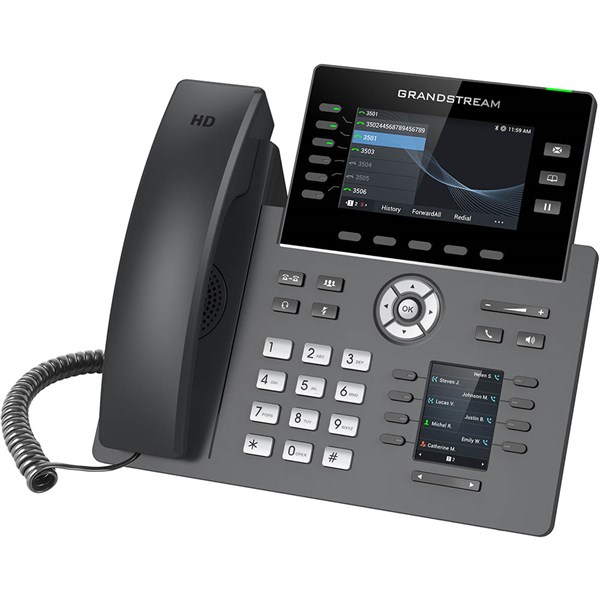 The GRP2616 is a high-end carrier-grade IP phone designed with zero-touch provisioning for mass deployment and easy management | It supports 6 lines and 6 SIP accounts while featuring a sleek design and a suite of next-generation features including integrated Wi-Fi, Bluetooth support, 48 virtual multi-purpose keys (MPKs), dual Gigabit ports and more | This device features a 4.3 inch color LCD screen with swappable face plates to allow for easy logo customization and an additional 2.4 inch display screen | For cloud provisioning and centralized management, the GRP2616 is supported by Grandstream's Device Management System (GDMS), which provides a centralized interface to configure, provision, manage and monitor deployments of Grandstream endpoints
