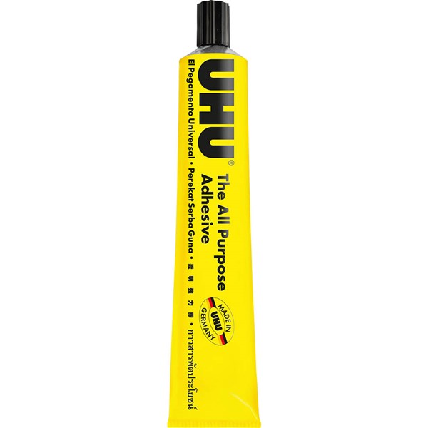Crystal-clear synthetic resin adhesive for a universal application | Liquid | Crystal-clear | Fast drying | Temporarily adjustable | Does not wrinkle paper | Universal - glues wood, wood based materials, plastics (ABS, hard and soft PVC, Plexiglas, polystyrene, Resopal), metal, glass, porcelain, ceramic, leather, rubber, felt, cork, fabrics, cardboard, paper, many plastics and much more | Do not use at temperatures below +5C | Materials to be glued must be clean, dry and free of dust and grease | For non-absorbent materials (e.g. ceramic, coated papers), apply to both sides of the assembly, leave to dry, re-apply and press the parts together | Contains volatile, highly inflammable solvents | Appropriate precautions should therefore be taken during storage or when working with the adhesive | Stains/residue | Remove wet glue stains immediately | Dried glue residue and glue stains in clothing can be removed with acetone | box for easy storage | This pack includes 1 UHU All Purpose Adhesive Liquid 125ml in a handy box for easy storage