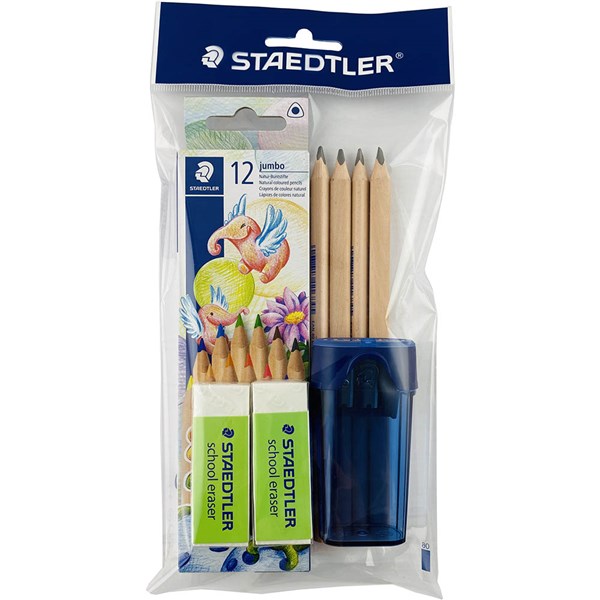 Perfect for students heading back to school or learning from home | The Staedtler Jumbo School Kit is the perfect individual stationery pack for Kindergarden through to Year 3 students | The essential school kit contains: 1 x 12 pack Staedtler jumbo coloured pencils; 4 x Staedtler jumbo triangular HB graphite pencils; 2 x Staedtler large school erasers; 1 x Staedtler slim double hole tub sharpener