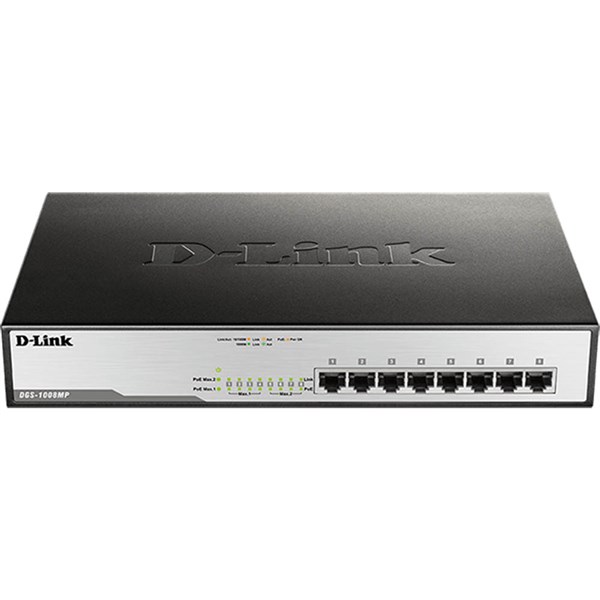 The D-Link DGS-1008MP 8-Port PoE Desktop Switch is an ideal solution for small offices and enterprise environments looking to expand the network with a set of Power over Ethernet devices such as wireless access points, IP cameras, and IP phones. Built with small business and enterprise users in mind, the DGS-1008MP is a high-speed, flexible switch that features a fanless, quiet design so it can be conveniently placed anywhere in a working environment | Superior Performance- No configuration is required and installation is quick and easy. Support for Auto-MDI/MDI-X on all ports eliminates the need for crossover cables when connecting to another switch. Auto-negotiation on each port senses the link speed of a network device (10, 100 or 1000 Mbps) and intelligently adjusts for compatibility and optimal performance. The switch has been designed without fans ensuring silent operation wherever it is installed. With wire-speed filtering and store-and-forward switching, the DGS-1008MP maximises network performance while minimising the transmission of bad network packets | Power over Ethernet- The DGS-1008MP features eight 10/100/1000BASE-T ports that support the IEEE 802.3at Power over Ethernet (PoE) standard, enabling these ports to supply up to 30 W of power to connected devices for a total PoE power budget of 125 W. This allows compatible devices to be connected without requiring an additional power supply, saving on cabling and allowing devices to be installed in locations without immediate access to power outlets | Energy Saving- DGS-1008MP switches feature both D-Link Green 3.0 Technology and IEEE802.3az Energy Efficient Ethernet (EEE) to cut operating costs without sacrificing operational performance or functionality. With D-Link Green technology, the switches constantly monitor the link status and network utilisation of every port. The switches also automatically detect cable length and can reduce transmission power usage for shorter cables. By pairing EEE capable devices with DGS-1008MP switches organizations can drastically reduce power consumption by automatically putting ports into a sleep mode when not being used