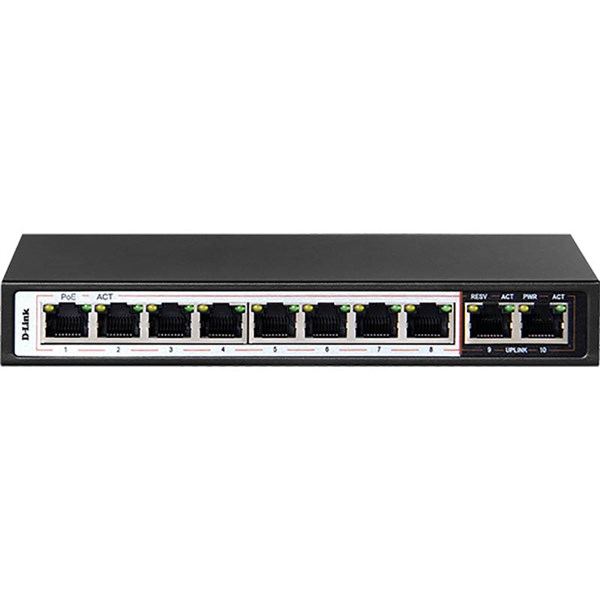 Robust and cost-effective PoE solution to provide power for your PoE powered devices such as IP cameras, CCTV, VoIP, Wi-Fi Access Points, etc | Has 10 ports in which 8 are long reach 250m ports and 2 are uplink ports | Up to 250m PoE and Data Transmission- Equipped with PoE extend technology, the DES-F1010P-E have the capability to supply 802.3af/at PoE and data connectivity on cables up to 250m long | 6KV Surge Protection- D-Link DES-F1010P-E switch is enhanced with 6KV surge protection. This effectively protects the switch against sudden electrical surges caused by events such as lightning strikes or unstable electrical current. Built-in 6 kV surge protection significantly reduces the chances of equipment being damaged from electrical surges, and effectively lowers maintenance costs by minimizing the need for expensive equipment repairs or replacement | Enhanced with VLAN Function- With a flick of button you can isolate switch ports from each other, but still allowing the devices to communicate via the uplink ports. This feature not only adds security but can also effectively suppress network storms and improve network performance | Enhanced with QoS- The DES-1010P-E switch performance is enhanced with QoS (Quality of Service) feature to ensure that critical network services such as IP surveillance, VoIP, IPTV are always given high priority. This feature makes the switch a perfect solution for IP Camera/CCTV applications | Intelligent Detection- With AI PoE feature enabled the switch can automatically detect an unresponsive PoE device and reboot the devices in order to recover it | 8 x 10/100 Mbps Fast Ethernet PoE+ Ports | 2 x 10/100 Mbps Uplink Ports | PoE+ support - up to 30W per port | Long Reach PoE support - up to 250m | Small additional features like Extend, VLAN, QoS and PoE Reset | Lightning protection built-in (6kV) | PoE Budget 96 Watts | Plug & Play Installation | Fanless | 250m Long Reach PoE | Compact Design for Home and Office Use: Yes | Fanless Design for Silent Operation: Yes | Quick, Simple Plug-and-Play Installation: Yes
