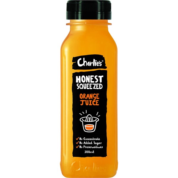 Charlie's Orange Juice comes in a 300ml PET bottle | Charlies Juice Orange contains no concentrate, no added sugar and no preservatives | Here at Charlie's, not much has changed since we squeezed our very first orange way back in '99 | We continue to produce the most outstanding OJ using the finest fruit and never add concentrate, preservatives or sugar | This one you're holding is filled to the brim with pick-of-the-bunch, juicy, squeezed oranges, leaving little room for anything else | Because this is orange juice after all | Pure and simple