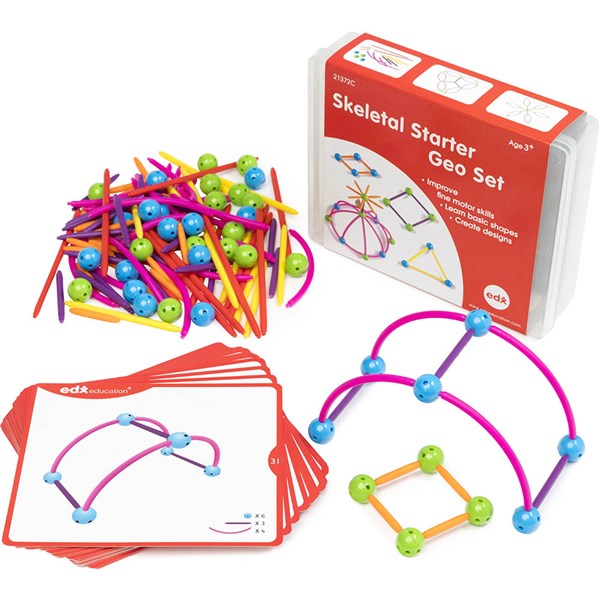 The Skeletal Starter Geo Set will improve children's fine motor skills, as well as develop their creative and problem solving skills | Build two and three dimensional structures | Introduces children to basic geometric shapes | Set includes 80 sticks in 4 sizes and 4 colours, 40 connecting balls in two colours, 24 quarter circles, and 20 x double sided activity cards, in sturdy container | WARNING | Chocking Hazard. Small Parts. Not for Children under 3 years