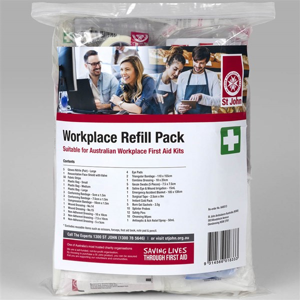 The Workplace Refill Pack comprises of a range of comprehensive first aid components | Complete with items to satisfy all workplace kits such as a wallmount, portable, waistbag and car kits | Excludes resuable items such as scissors, forceps, first aid book, note pad and pencil | Components meet the WHS Code of Practice | includes an antiseptic and itch spray | Components included in a zip lock bag | Contains the following | 5 x Gloves Nitrile (Pair) - Large | 1 x Resuscitation Face Shield | 50 x Fabric Strips | 1 x Plastic Bag - Small | 1 x Plastic Bag - Medium | 1 x Plastic Bag - Large | 3 x Conforming Bandage - 5cm x 1.5m | 3 x Conforming Bandage - 7.5cm x 1.5m | 1 x Compression Bandage -10cm x 1.5m | 1 x Wound Dressing - No.14 | 1 x Wound Dressing - No.15 | 1 x Non-Adherent Dressing - 10 x 10cm | 3 x Non-Adherent Dressing - 7.5 x 10cm | 6 x Non-Adherent Dressing - 5 x 5cm | 4 x Eye Pads | 2 x Triangular Bandage - 110 x 155cm | 1 x Combine Dressing - 10 x 20cm | 5 x Gauze Swabs (5 Pieces) - 7.5 x 7.5cm | 8 x Saline Eye & Wound Irrigation - 15mL | 1 x Emergency Accident Blanket - 185 x 130cm | 1 x Surgical Tape - 2.5cm x 9m | 1 x Instant Cold Pack | 5 x Burn Gel Sachets - 3.5g | 10 x Splinter Probes | 12 x Safety Pins | 10 x Cleansing Wipes | 1 x Antiseptic and Itch Relief Spray