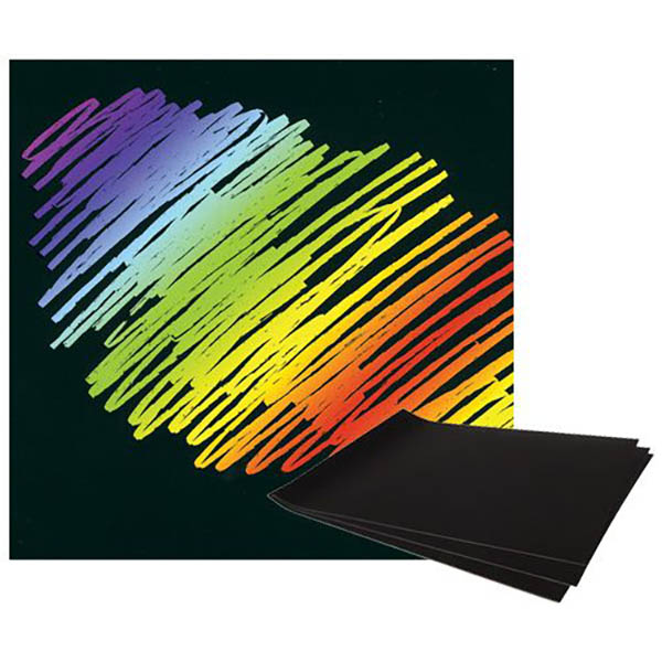 A4 rainbow scraper card with a heavier surface than Scratch-Art Paper making it suitable for all ages | Scratch back the black coating using the wooden stylus to reveal bright rainbow colours underneath | Create designs to use for gift cards or other paper craft activities | Create designs to glue on to cards and other cardboard templates | Pack of 12