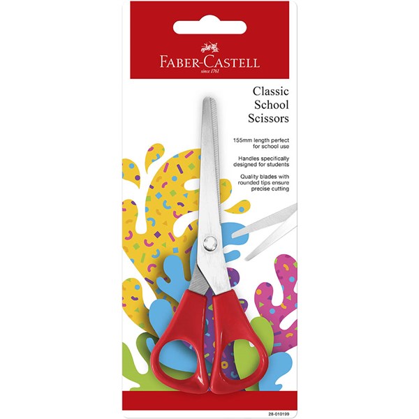 Encourage crafty ideas and help refine hand eye coordination with Faber-Castell Classic School Scissors | Featuring stainless steel blades that glide through paper, card and craft materials with ease, these reliable scissors are essential companions for any school pencil case | 155mm length is ideal for school use | Compact design easily fits in student pencil cases for easy transport | Stainless steel blades with rounded tips ensure precise cutting | Durable handles are specially designed for students | Blades glide through paper, card and craft materials for effortless use