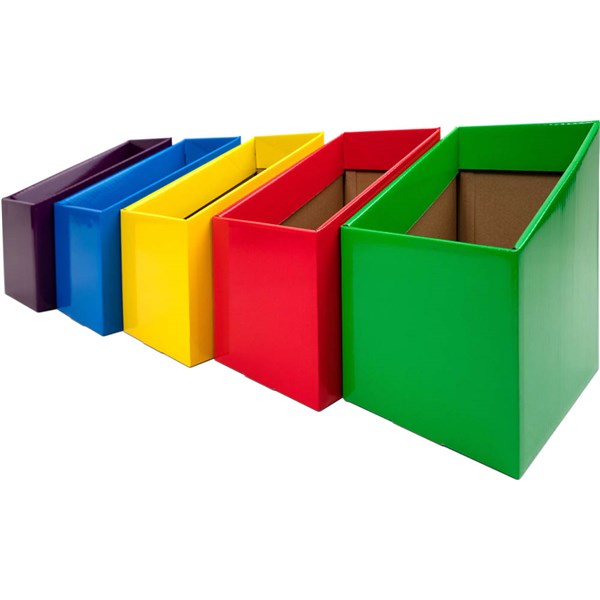 These sturdy book boxes are the ideal size for general book and paper storage | Sold in packs of 5 in mix colour packs | Mix Pack 1 each Red, Light Blue, Yellow, Green, Purple | Pack of 5