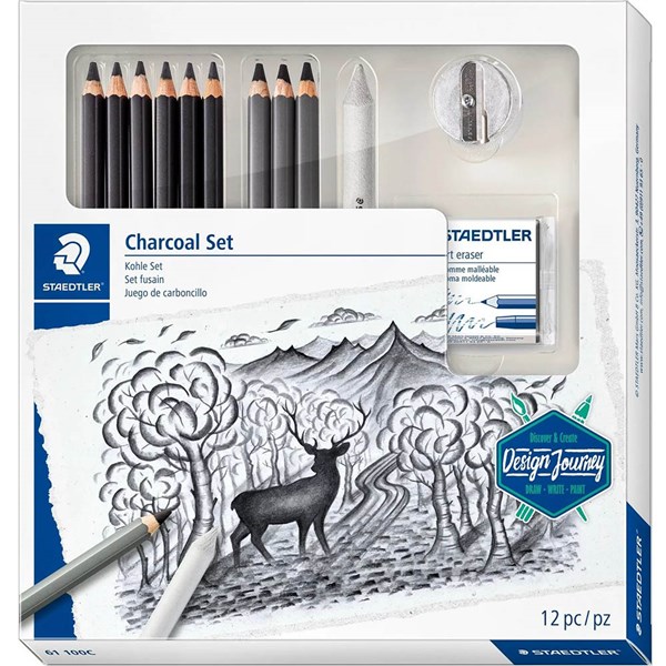 Staedtler Mars 100C Lumograph charcoal Mixed Charcoal pencil set | High quality charcoal pencil | Special lead formulation containing a high proportion of carbon and charcoal for a wide range of deepest black tones | Particularly suitable for blending and hatching as well as for expressive sketches and portraits | Available in 3 finely graded consistent degrees: S (soft), M (medium), H (hard) | Lead diameter: 4.5 mm | The deepest black shade glides softly across the paper | Lines reproduce well | Wood from certified, sustainably managed forests | Containing 6 drawing pencils in assorted degrees, 3 charcool pencils in assorted degrees, 1 paper stump, 1 kneadable eraser and 1 double-hole sharpener | This item is manufactured in Germany